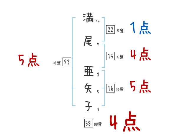 外運![]() | 満尾亜矢子さんの外運は23画の5つ星!想像力に優れ活力がある。一代で成功し名誉を手に入れる。 生活面を象徴する運勢です。外部から受ける影響力を表し、結婚運、家庭運や職場、環境への順応性を表します。 |