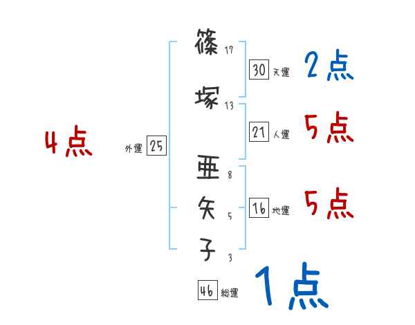 天運![]() | 篠塚亜矢子さんの天運は30画の2つ星!浮き沈みの激しさに注意しましょう。 家系が持つ宿命的な運勢を表します。祖先から受け継いだ苗字ですので自分の力が及びません。家柄を象徴します。 |