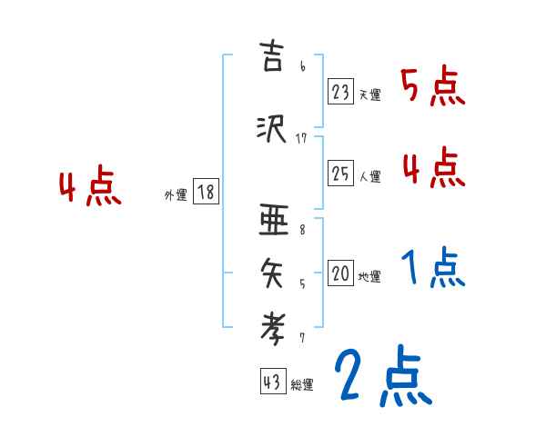 総運![]() | 吉沢亜矢孝さんの総運は43画の2つ星!頑固な性格で独立心が強いかも。やや非現実的で浪費に注意しましょう。 あなたの人生を表す1番重要な運勢です。生涯を通じて影響する総合運となり、主に50歳以降の晩年期に影響を及ぼします。 |