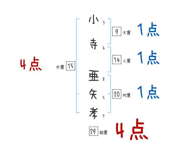 天運![]() | 小寺亜矢孝さんの天運は9画の1つ星!消極的で才能を発揮することが苦手なことも。周りの意見に耳を傾けましょう。 家系が持つ宿命的な運勢を表します。祖先から受け継いだ苗字ですので自分の力が及びません。家柄を象徴します。 |