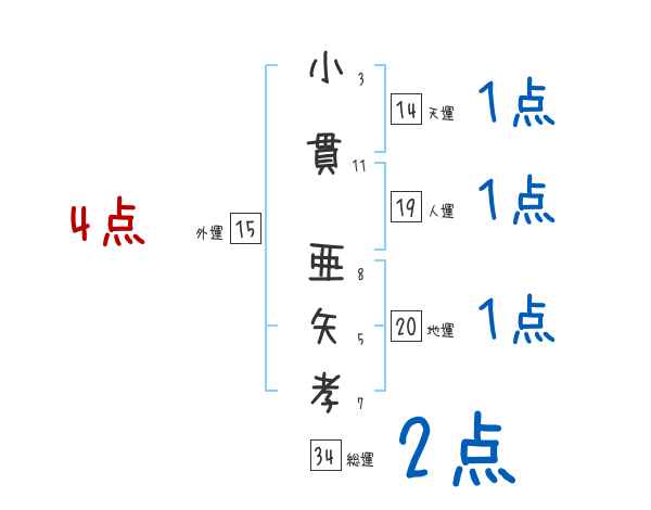 総運![]() | 小貫亜矢孝さんの総運は34画の2つ星!独創性に優れるが、自尊心が強く災難に注意しましょう。 あなたの人生を表す1番重要な運勢です。生涯を通じて影響する総合運となり、主に50歳以降の晩年期に影響を及ぼします。 |