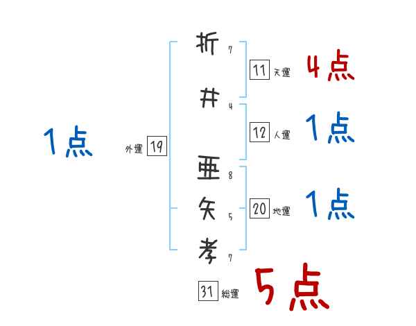 天運![]() | 折井亜矢孝さんの天運は11画の4つ星!着実に富や地位を得る幸運な人生。 家系が持つ宿命的な運勢を表します。祖先から受け継いだ苗字ですので自分の力が及びません。家柄を象徴します。 |