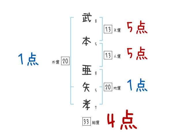 天運![]() | 武本亜矢孝さんの天運は13画の5つ星!才能に恵まれ人気がある。名声を手に入れる。円満な人生。 家系が持つ宿命的な運勢を表します。祖先から受け継いだ苗字ですので自分の力が及びません。家柄を象徴します。 |