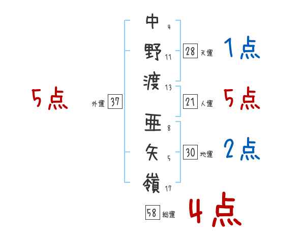 天運![]() | 中野渡亜矢嶺さんの天運は28画の1つ星!家庭環境に注意。スポーツで活躍できる能力があるかも。 家系が持つ宿命的な運勢を表します。祖先から受け継いだ苗字ですので自分の力が及びません。家柄を象徴します。 |