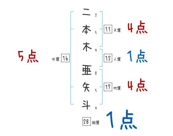 外運![]() | 二本木亜矢斗さんの外運は16画の5つ星!人望が厚く大きく発展する。逆転成功が見える。 生活面を象徴する運勢です。外部から受ける影響力を表し、結婚運、家庭運や職場、環境への順応性を表します。 |