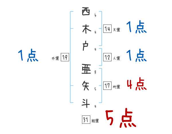 総運![]() | 西木戸亜矢斗さんの総運は31画の5つ星!社交性があり判断力に優れる。順風満帆な人生で円満な生活。 あなたの人生を表す1番重要な運勢です。生涯を通じて影響する総合運となり、主に50歳以降の晩年期に影響を及ぼします。 |