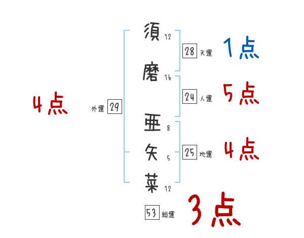天運![]() | 須磨亜矢菜さんの天運は28画の1つ星!家庭環境に注意。スポーツで活躍できる能力があるかも。 家系が持つ宿命的な運勢を表します。祖先から受け継いだ苗字ですので自分の力が及びません。家柄を象徴します。 |