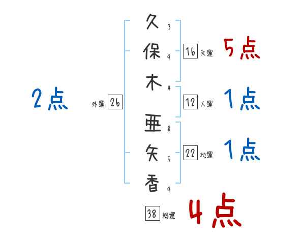 外運![]() | 久保木亜矢香さんの外運は26画の2つ星!波瀾万丈かも。信頼できる人を大事にしましょう。 生活面を象徴する運勢です。外部から受ける影響力を表し、結婚運、家庭運や職場、環境への順応性を表します。 |