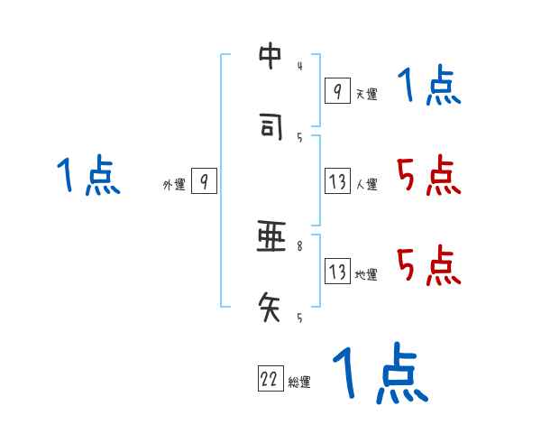総運![]() | 中司亜矢さんの総運は22画の1つ星!努力することが苦手ないっぽう手先が器用。芸術性にも優れる。 あなたの人生を表す1番重要な運勢です。生涯を通じて影響する総合運となり、主に50歳以降の晩年期に影響を及ぼします。 |