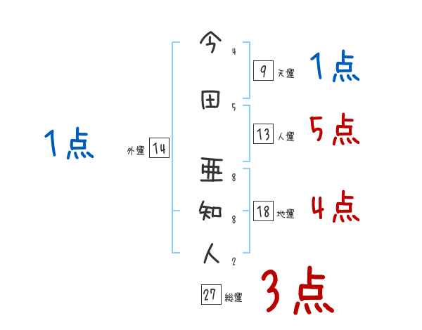 外運![]() | 今田亜知人さんの外運は14画の1つ星!人に対して優しいがストレスを溜め込みがち。人間関係のトラブルを避けるよう気をつけましょう。 生活面を象徴する運勢です。外部から受ける影響力を表し、結婚運、家庭運や職場、環境への順応性を表します。 |