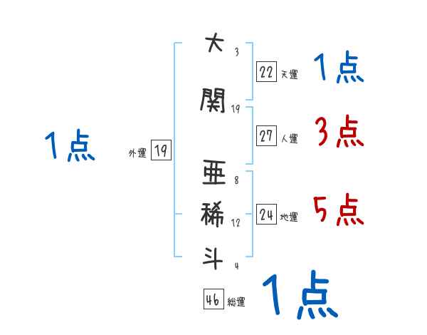 天運![]() | 大関亜稀斗さんの天運は22画の1つ星!努力することが苦手ないっぽう手先が器用。芸術性にも優れる。 家系が持つ宿命的な運勢を表します。祖先から受け継いだ苗字ですので自分の力が及びません。家柄を象徴します。 |