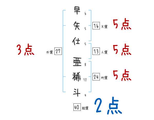 天運![]() | 早矢仕亜稀斗さんの天運は16画の5つ星!人望が厚く大きく発展する。逆転成功が見える。 家系が持つ宿命的な運勢を表します。祖先から受け継いだ苗字ですので自分の力が及びません。家柄を象徴します。 |