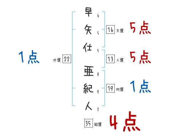 天運![]() | 早矢仕亜紀人さんの天運は16画の5つ星!人望が厚く大きく発展する。逆転成功が見える。 家系が持つ宿命的な運勢を表します。祖先から受け継いだ苗字ですので自分の力が及びません。家柄を象徴します。 |