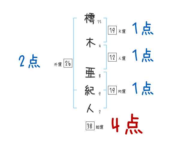 外運![]() | 樗木亜紀人さんの外運は26画の2つ星!波瀾万丈かも。信頼できる人を大事にしましょう。 生活面を象徴する運勢です。外部から受ける影響力を表し、結婚運、家庭運や職場、環境への順応性を表します。 |