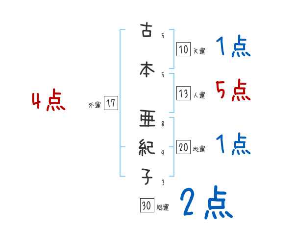 総運![]() | 古本亜紀子さんの総運は30画の2つ星!浮き沈みの激しさに注意しましょう。 あなたの人生を表す1番重要な運勢です。生涯を通じて影響する総合運となり、主に50歳以降の晩年期に影響を及ぼします。 |