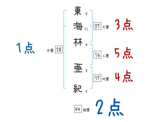 総運![]() | 東海林亜紀さんの総運は44画の2つ星!誠実で慎重な性格。物事を考えすぎないように注意しましょう。 あなたの人生を表す1番重要な運勢です。生涯を通じて影響する総合運となり、主に50歳以降の晩年期に影響を及ぼします。 |