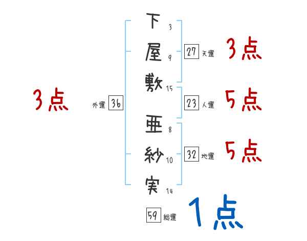 外運![]() | 下屋敷亜紗実さんの外運は36画の3つ星!先見性が豊かです。多少神経質で苦労することも。 生活面を象徴する運勢です。外部から受ける影響力を表し、結婚運、家庭運や職場、環境への順応性を表します。 |
