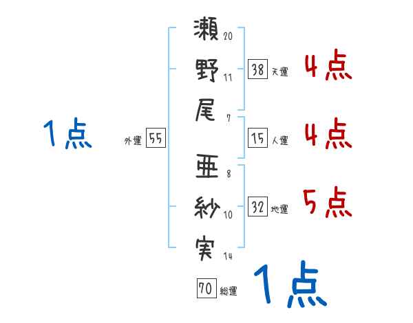 地運![]() | 瀬野尾亜紗実さんの地運は32画の5つ星!柔軟性があり成功する。チャンスが多く金運が良い。 個性を表す基礎的な運勢です。性格形成や対人関係、行動力など家庭環境に影響されます。主に誕生してから20歳くらいまでの若年期の運勢を表します。 |