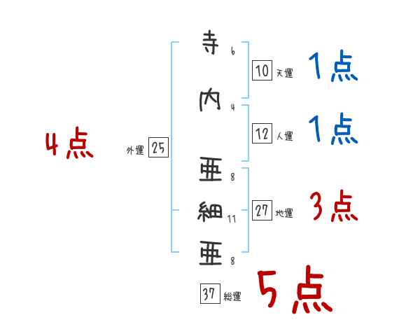 天運![]() | 寺内亜細亜さんの天運は10画の1つ星!不安を感じやすい傾向。ストレスを抱えないように注意しましょう。 家系が持つ宿命的な運勢を表します。祖先から受け継いだ苗字ですので自分の力が及びません。家柄を象徴します。 |