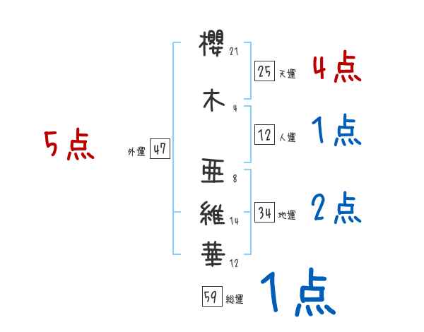 外運![]() | 櫻木亜維華さんの外運は47画の5つ星!実力が開花し発展する円満な人生。財に恵まれる。 生活面を象徴する運勢です。外部から受ける影響力を表し、結婚運、家庭運や職場、環境への順応性を表します。 |