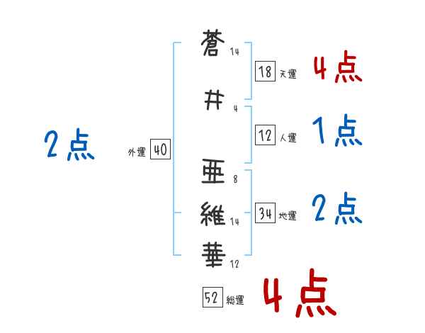 天運![]() | 蒼井亜維華さんの天運は18画の4つ星!情熱的で剛気。忍耐力があり信頼される。 家系が持つ宿命的な運勢を表します。祖先から受け継いだ苗字ですので自分の力が及びません。家柄を象徴します。 |
