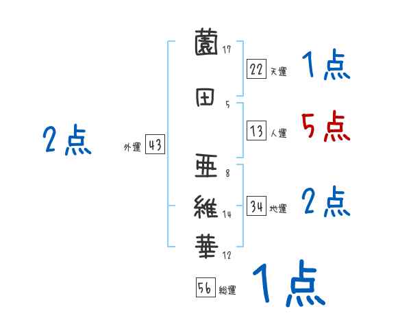 総運![]() | 薗田亜維華さんの総運は56画の1つ星!消極的で無気力になりがち。誠実な気持ちが必要でしょう。 あなたの人生を表す1番重要な運勢です。生涯を通じて影響する総合運となり、主に50歳以降の晩年期に影響を及ぼします。 |