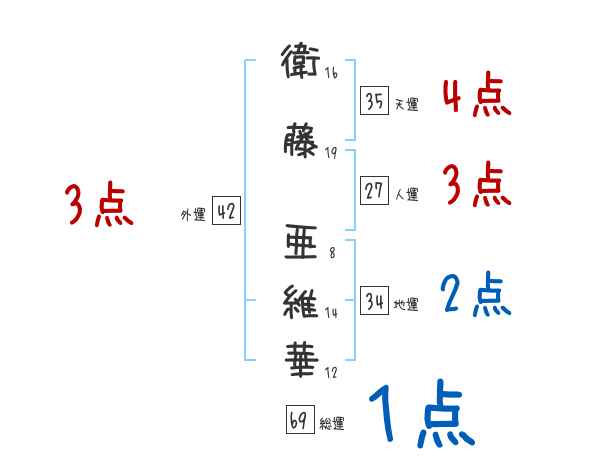 天運![]() | 衛藤亜維華さんの天運は35画の4つ星!温厚な性格で感受性が高い。穏和な性格で人望が厚い。 家系が持つ宿命的な運勢を表します。祖先から受け継いだ苗字ですので自分の力が及びません。家柄を象徴します。 |