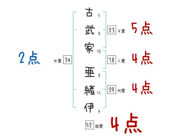 天運![]() | 古武家亜緒伊さんの天運は23画の5つ星!想像力に優れ活力がある。一代で成功し名誉を手に入れる。 家系が持つ宿命的な運勢を表します。祖先から受け継いだ苗字ですので自分の力が及びません。家柄を象徴します。 |
