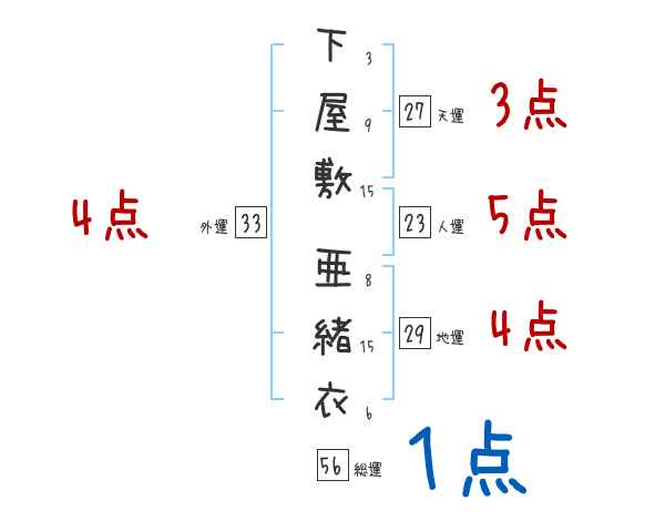 外運![]() | 下屋敷亜緒衣さんの外運は33画の4つ星!権力志向でプライドが高い。勇気があり運を切り開き成功する。 生活面を象徴する運勢です。外部から受ける影響力を表し、結婚運、家庭運や職場、環境への順応性を表します。 |