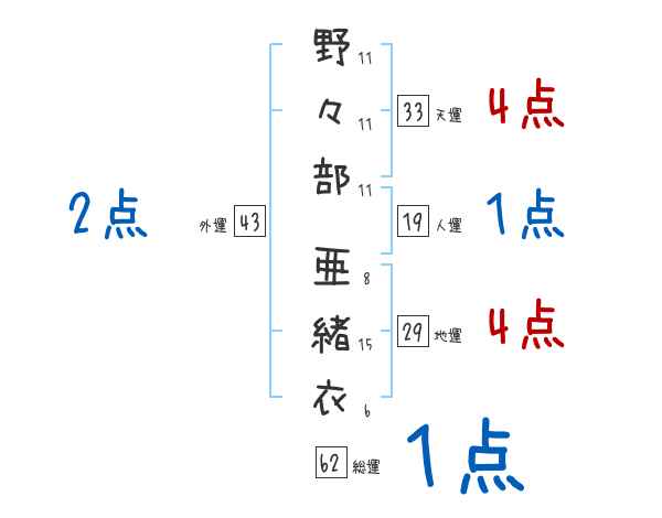 地運![]() | 野々部亜緒衣さんの地運は29画の4つ星!完全主義で才能がある。厳格な心の持ち主。 個性を表す基礎的な運勢です。性格形成や対人関係、行動力など家庭環境に影響されます。主に誕生してから20歳くらいまでの若年期の運勢を表します。 |