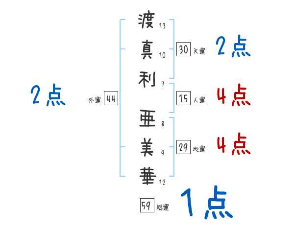 天運![]() | 渡真利亜美華さんの天運は30画の2つ星!浮き沈みの激しさに注意しましょう。 家系が持つ宿命的な運勢を表します。祖先から受け継いだ苗字ですので自分の力が及びません。家柄を象徴します。 |