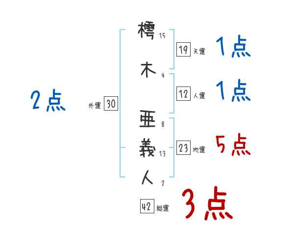総運![]() | 樗木亜義人さんの総運は42画の3つ星!病気に注意。多芸であるが消極的でおとなしい。 あなたの人生を表す1番重要な運勢です。生涯を通じて影響する総合運となり、主に50歳以降の晩年期に影響を及ぼします。 |