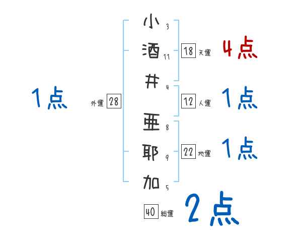 天運![]() | 小酒井亜耶加さんの天運は18画の4つ星!情熱的で剛気。忍耐力があり信頼される。 家系が持つ宿命的な運勢を表します。祖先から受け継いだ苗字ですので自分の力が及びません。家柄を象徴します。 |