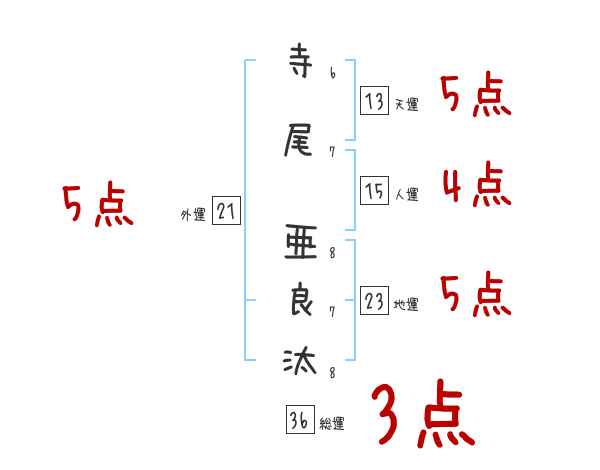 総運![]() | 寺尾亜良汰さんの総運は36画の3つ星!先見性が豊かです。多少神経質で苦労することも。 あなたの人生を表す1番重要な運勢です。生涯を通じて影響する総合運となり、主に50歳以降の晩年期に影響を及ぼします。 |