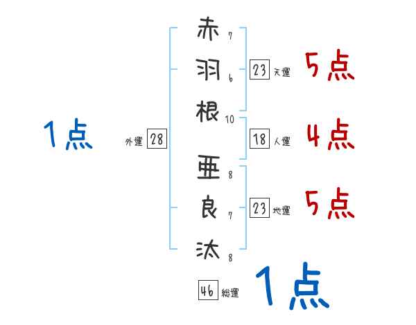 天運![]() | 赤羽根亜良汰さんの天運は23画の5つ星!想像力に優れ活力がある。一代で成功し名誉を手に入れる。 家系が持つ宿命的な運勢を表します。祖先から受け継いだ苗字ですので自分の力が及びません。家柄を象徴します。 |
