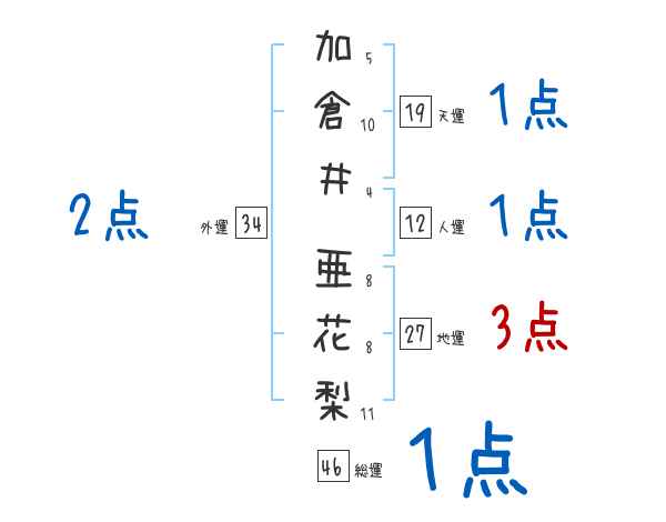 総運![]() | 加倉井亜花梨さんの総運は46画の1つ星!迷走することが多く苦労するかも。目先のことにとらわれないように。 あなたの人生を表す1番重要な運勢です。生涯を通じて影響する総合運となり、主に50歳以降の晩年期に影響を及ぼします。 |