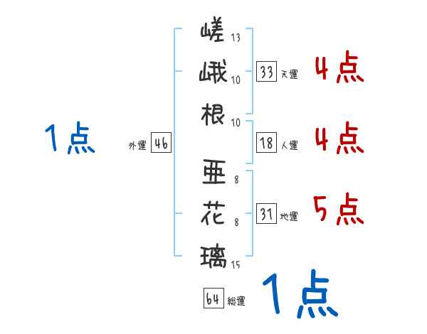 天運![]() | 嵯峨根亜花璃さんの天運は33画の4つ星!権力志向でプライドが高い。勇気があり運を切り開き成功する。 家系が持つ宿命的な運勢を表します。祖先から受け継いだ苗字ですので自分の力が及びません。家柄を象徴します。 |