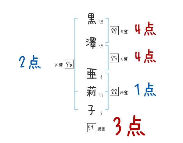 外運![]() | 黒澤亜莉子さんの外運は26画の2つ星!波瀾万丈かも。信頼できる人を大事にしましょう。 生活面を象徴する運勢です。外部から受ける影響力を表し、結婚運、家庭運や職場、環境への順応性を表します。 |