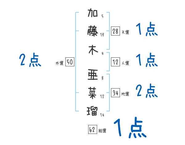 天運![]() | 加藤木亜菜瑠さんの天運は28画の1つ星!家庭環境に注意。スポーツで活躍できる能力があるかも。 家系が持つ宿命的な運勢を表します。祖先から受け継いだ苗字ですので自分の力が及びません。家柄を象徴します。 |