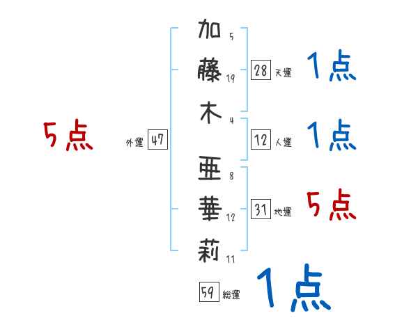 外運![]() | 加藤木亜華莉さんの外運は47画の5つ星!実力が開花し発展する円満な人生。財に恵まれる。 生活面を象徴する運勢です。外部から受ける影響力を表し、結婚運、家庭運や職場、環境への順応性を表します。 |
