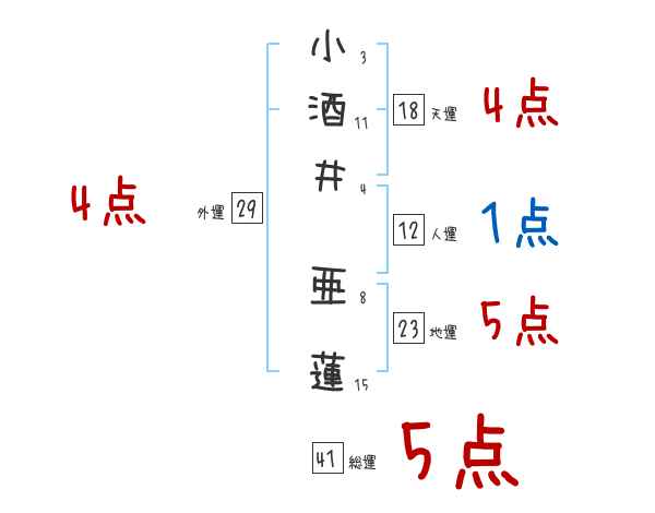 外運![]() | 小酒井亜蓮さんの外運は29画の4つ星!完全主義で才能がある。厳格な心の持ち主。 生活面を象徴する運勢です。外部から受ける影響力を表し、結婚運、家庭運や職場、環境への順応性を表します。 |