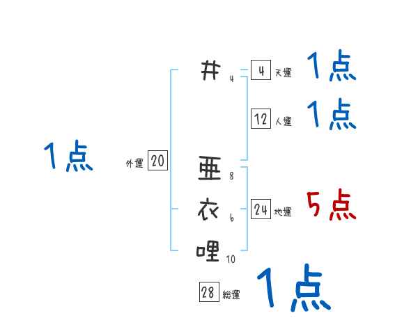 天運![]() | 井亜衣哩さんの天運は4画の1つ星!感情が不安定で苦労するかも。周囲との協調を心掛けましょう。 家系が持つ宿命的な運勢を表します。祖先から受け継いだ苗字ですので自分の力が及びません。家柄を象徴します。 |