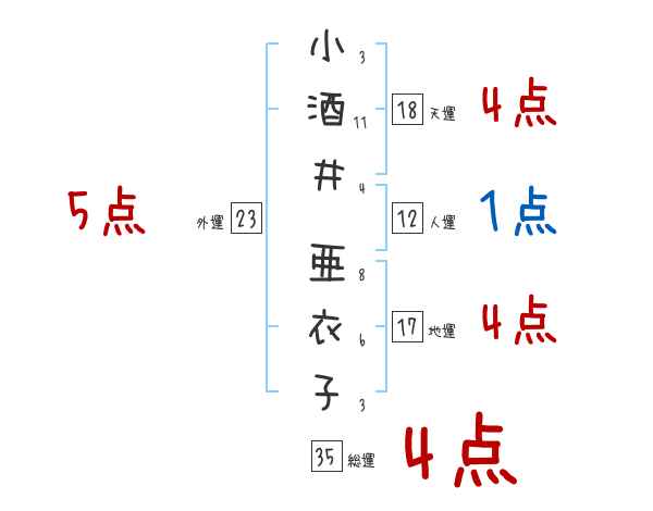 天運![]() | 小酒井亜衣子さんの天運は18画の4つ星!情熱的で剛気。忍耐力があり信頼される。 家系が持つ宿命的な運勢を表します。祖先から受け継いだ苗字ですので自分の力が及びません。家柄を象徴します。 |