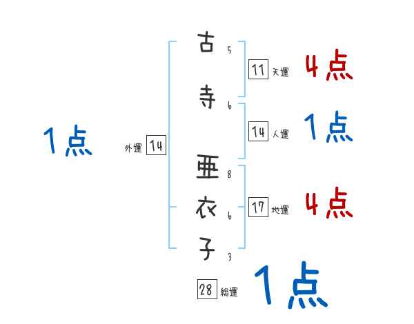 天運![]() | 古寺亜衣子さんの天運は11画の4つ星!着実に富や地位を得る幸運な人生。 家系が持つ宿命的な運勢を表します。祖先から受け継いだ苗字ですので自分の力が及びません。家柄を象徴します。 |