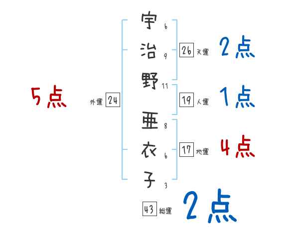 外運![]() | 宇治野亜衣子さんの外運は24画の5つ星!家庭運が良く順調な人生。金運にも恵まれる。 生活面を象徴する運勢です。外部から受ける影響力を表し、結婚運、家庭運や職場、環境への順応性を表します。 |