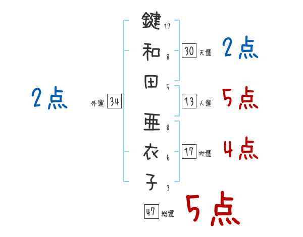 天運![]() | 鍵和田亜衣子さんの天運は30画の2つ星!浮き沈みの激しさに注意しましょう。 家系が持つ宿命的な運勢を表します。祖先から受け継いだ苗字ですので自分の力が及びません。家柄を象徴します。 |