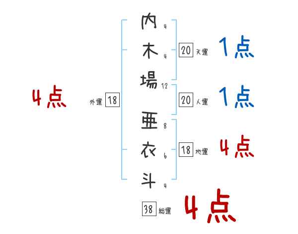 外運![]() | 内木場亜衣斗さんの外運は18画の4つ星!情熱的で剛気。忍耐力があり信頼される。 生活面を象徴する運勢です。外部から受ける影響力を表し、結婚運、家庭運や職場、環境への順応性を表します。 |