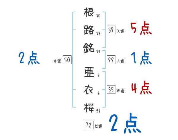 総運![]() | 根路銘亜衣桜さんの総運は72画の2つ星!災難が多く不安定な生活にならないように注意。明暗のある人生かも。 あなたの人生を表す1番重要な運勢です。生涯を通じて影響する総合運となり、主に50歳以降の晩年期に影響を及ぼします。 |