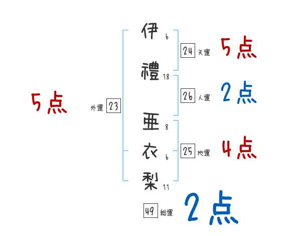 外運![]() | 伊禮亜衣梨さんの外運は23画の5つ星!想像力に優れ活力がある。一代で成功し名誉を手に入れる。 生活面を象徴する運勢です。外部から受ける影響力を表し、結婚運、家庭運や職場、環境への順応性を表します。 |