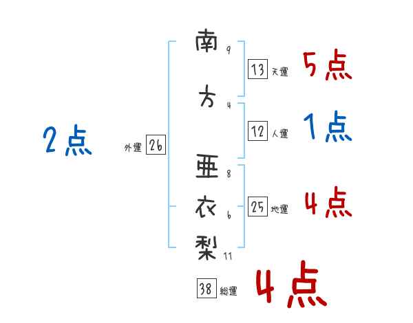 外運![]() | 南方亜衣梨さんの外運は26画の2つ星!波瀾万丈かも。信頼できる人を大事にしましょう。 生活面を象徴する運勢です。外部から受ける影響力を表し、結婚運、家庭運や職場、環境への順応性を表します。 |